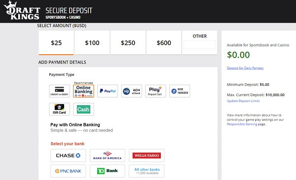 The other deposit methods are Apple Pay, an eCheck through ACH, bill pay, DraftKings gift card, PayPal, Venmo, or a bank wire. Bank wires are only for deposits of $100 or more.